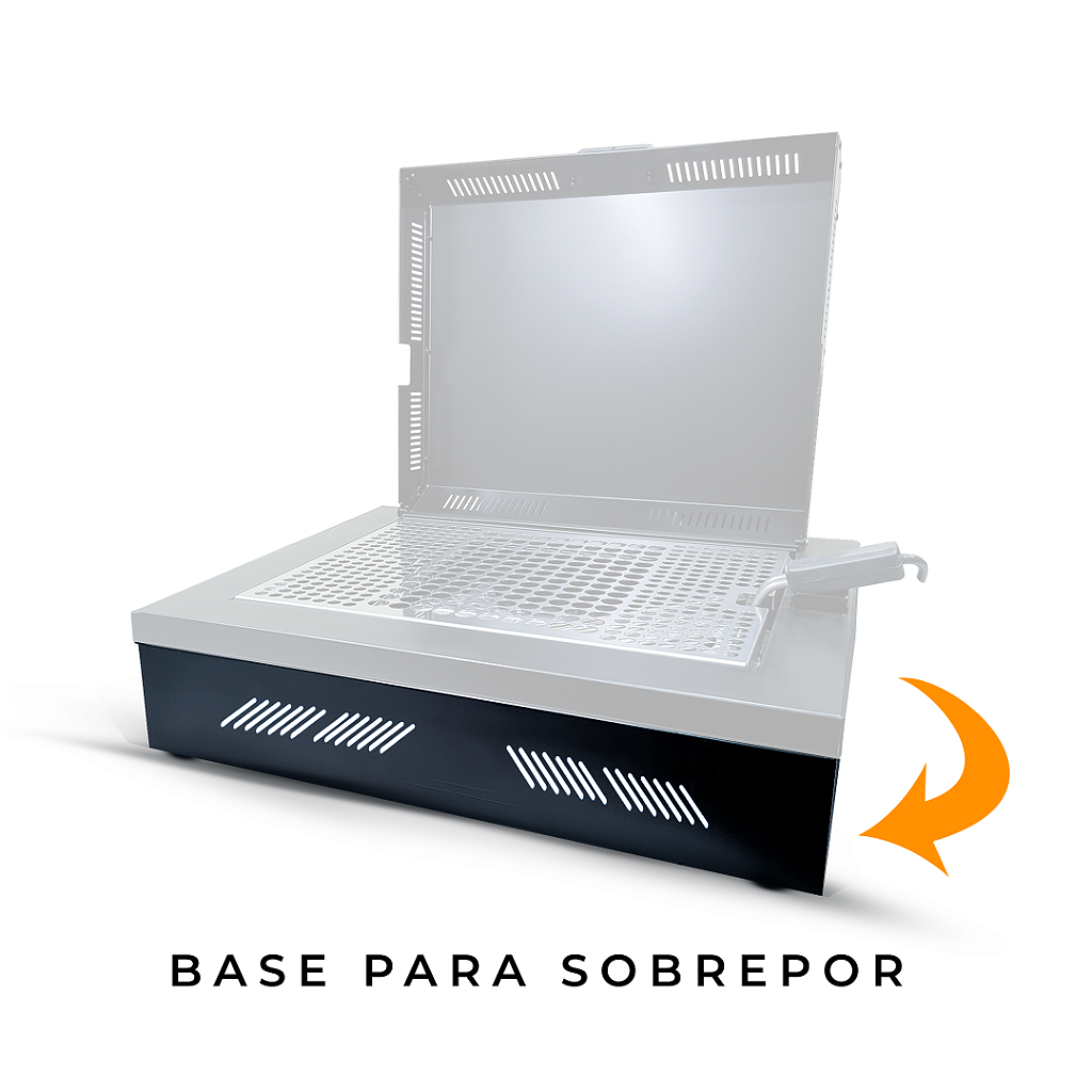 Fabricada em alumínio de alta qualidade, a base possui dimensões de 47,5 cm de comprimento, 44 cm de largura e 11,5 cm de altura, garantindo robustez e durabilidade. Seu modelo embutido ou sobrepor é especialmente recomendado para uso com a churrasqueira LR, otimizando o espaço e facilitando o manuseio durante o preparo dos alimentos.